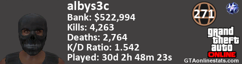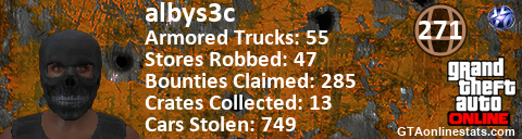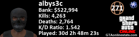 <a href="http://GTAonlinestats.com/showplayer/albys3c"><img src="http://GTAonlinestats.com/randomsignature/albys3c/sig.png" alt="albys3c" border="0" /></a>