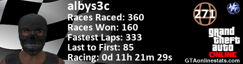 <a href="http://GTAonlinestats.com/showplayer/albys3c"><img src="http://GTAonlinestats.com/racesignature/albys3c/sig.png" alt="albys3c" border="0" /></a>