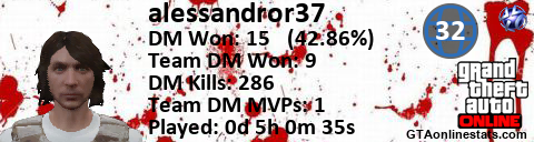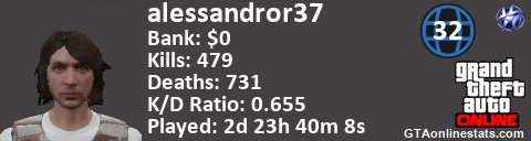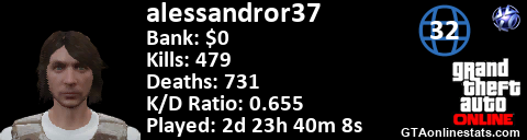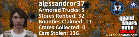 <a href="http://GTAonlinestats.com/showplayer/alessandror37"><img src="http://GTAonlinestats.com/randomsignature/alessandror37/sig.png" alt="alessandror37" border="0" /></a>