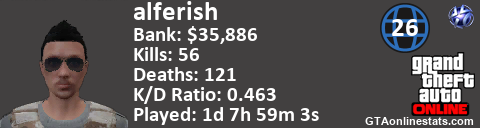 <a href="http://GTAonlinestats.com/showplayer/alferish"><img src="http://GTAonlinestats.com/signature/alferish/sig.png" alt="Alferish" border="0" /></a>