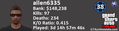 <a href="http://GTAonlinestats.com/showplayer/allen6335"><img src="http://GTAonlinestats.com/signature/allen6335/sig.png" alt="allen6335" border="0" /></a>