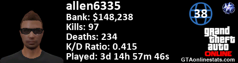 [URL=http://GTAonlinestats.com/showplayer/allen6335][IMG]http://GTAonlinestats.com/signature/allen6335/sig.png[/IMG][/URL]