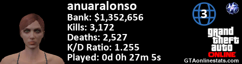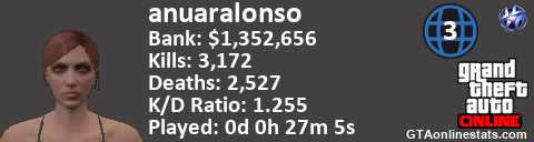 <a href="http://GTAonlinestats.com/showplayer/anuaralonso/2"><img src="http://GTAonlinestats.com/signature/anuaralonso/2/sig.png" alt="anuaralonso" border="0" /></a>