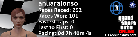 [URL=http://GTAonlinestats.com/showplayer/anuaralonso/2][IMG]http://GTAonlinestats.com/racesignature/anuaralonso/2/sig.png[/IMG][/URL]