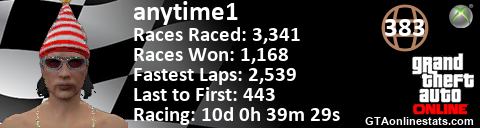 <a href="http://GTAonlinestats.com/showplayer/anytime1"><img src="http://GTAonlinestats.com/racesignature/anytime1/sig.png" alt="anytime1" border="0" /></a>