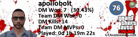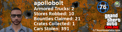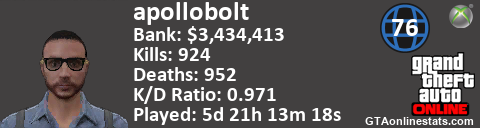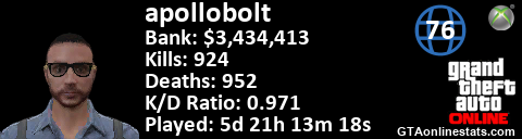 <a href="http://GTAonlinestats.com/showplayer/apollobolt"><img src="http://GTAonlinestats.com/signature/apollobolt/sig.png" alt="apollobolt" border="0" /></a>