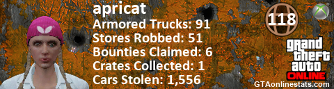 [URL=http://GTAonlinestats.com/showplayer/apricat][IMG]http://GTAonlinestats.com/crimesignature/apricat/sig.png[/IMG][/URL]