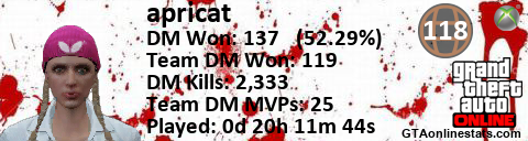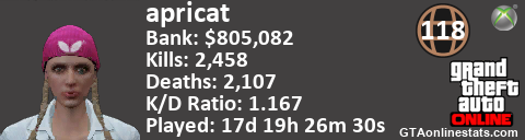 [URL=http://GTAonlinestats.com/showplayer/apricat][IMG]http://GTAonlinestats.com/dmsignature/apricat/sig.png[/IMG][/URL]