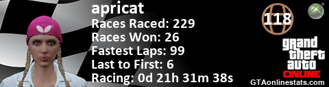 [URL=http://GTAonlinestats.com/showplayer/apricat][IMG]http://GTAonlinestats.com/racesignature/apricat/sig.png[/IMG][/URL]