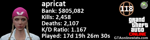 <a href="http://GTAonlinestats.com/showplayer/apricat"><img src="http://GTAonlinestats.com/randomsignature/apricat/sig.png" alt="apricat" border="0" /></a>