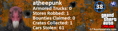 [URL=http://GTAonlinestats.com/showplayer/atheepunk/2][IMG]http://GTAonlinestats.com/crimesignature/atheepunk/2/sig.png[/IMG][/URL]