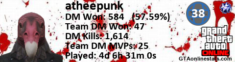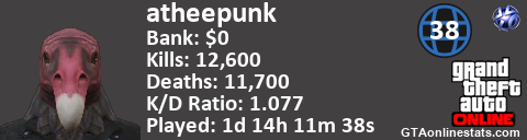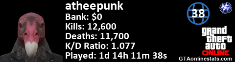 [URL=http://GTAonlinestats.com/showplayer/atheepunk/2][IMG]http://GTAonlinestats.com/signature/atheepunk/2/sig.png[/IMG][/URL]