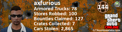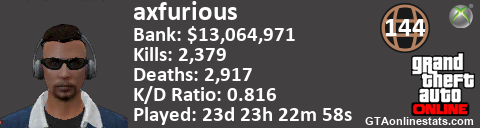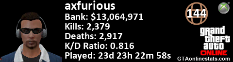 <a href="http://GTAonlinestats.com/showplayer/axfurious"><img src="http://GTAonlinestats.com/signature/axfurious/sig.png" alt="axfurious" border="0" /></a>