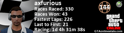 <a href="http://GTAonlinestats.com/showplayer/axfurious"><img src="http://GTAonlinestats.com/racesignature/axfurious/sig.png" alt="axfurious" border="0" /></a>