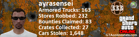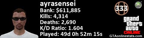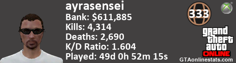 <a href="http://GTAonlinestats.com/showplayer/ayrasensei"><img src="http://GTAonlinestats.com/dmsignature/ayrasensei/sig.png" alt="AyraSensei" border="0" /></a>