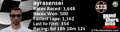 [URL=http://GTAonlinestats.com/showplayer/ayrasensei][IMG]http://GTAonlinestats.com/racesignature/ayrasensei/sig.png[/IMG][/URL]