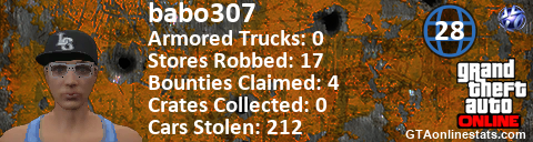 [URL=http://GTAonlinestats.com/showplayer/babo307][IMG]http://GTAonlinestats.com/crimesignature/babo307/sig.png[/IMG][/URL]