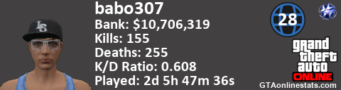 <a href="http://GTAonlinestats.com/showplayer/babo307"><img src="http://GTAonlinestats.com/randomsignature/babo307/sig.png" alt="babo307" border="0" /></a>