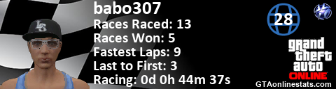[URL=http://GTAonlinestats.com/showplayer/babo307][IMG]http://GTAonlinestats.com/racesignature/babo307/sig.png[/IMG][/URL]