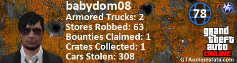 [URL=http://GTAonlinestats.com/showplayer/babydom08][IMG]http://GTAonlinestats.com/crimesignature/babydom08/sig.png[/IMG][/URL]