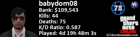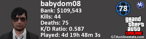 <a href="http://GTAonlinestats.com/showplayer/babydom08"><img src="http://GTAonlinestats.com/signature/babydom08/sig.png" alt="Babydom08" border="0" /></a>