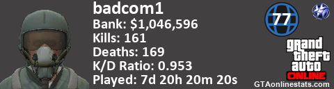 [URL=http://GTAonlinestats.com/showplayer/badcom1][IMG]http://GTAonlinestats.com/signature/badcom1/sig.png[/IMG][/URL]