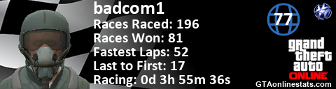 [URL=http://GTAonlinestats.com/showplayer/badcom1][IMG]http://GTAonlinestats.com/racesignature/badcom1/sig.png[/IMG][/URL]