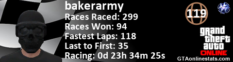 <a href="http://GTAonlinestats.com/showplayer/bakerarmy"><img src="http://GTAonlinestats.com/racesignature/bakerarmy/sig.png" alt="bakerarmy" border="0" /></a>