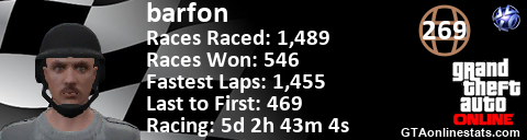[URL=http://GTAonlinestats.com/showplayer/barfon][IMG]http://GTAonlinestats.com/racesignature/barfon/sig.png[/IMG][/URL]
