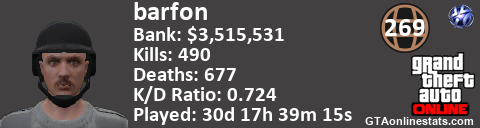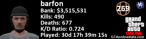 <a href="http://GTAonlinestats.com/showplayer/barfon"><img src="http://GTAonlinestats.com/dmsignature/barfon/sig.png" alt="barfon" border="0" /></a>