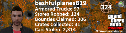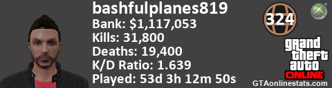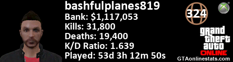 <a href="http://GTAonlinestats.com/showplayer/bashfulplanes819"><img src="http://GTAonlinestats.com/signature/bashfulplanes819/sig.png" alt="bashfulplanes819" border="0" /></a>