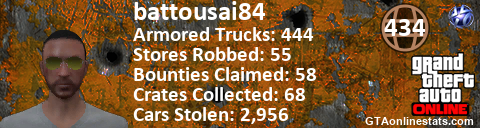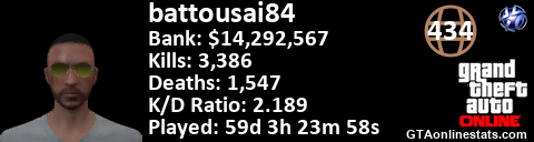 <a href="http://GTAonlinestats.com/showplayer/battousai84"><img src="http://GTAonlinestats.com/signature/battousai84/sig.png" alt="Battousai84" border="0" /></a>