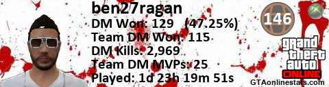 [URL=http://GTAonlinestats.com/showplayer/ben27ragan][IMG]http://GTAonlinestats.com/dmsignature/ben27ragan/sig.png[/IMG][/URL]