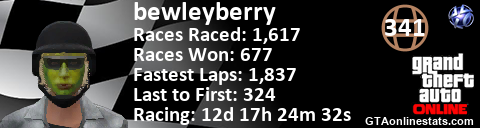 [URL=http://GTAonlinestats.com/showplayer/bewleyberry][IMG]http://GTAonlinestats.com/racesignature/bewleyberry/sig.png[/IMG][/URL]