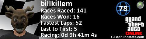 <a href="http://GTAonlinestats.com/showplayer/billkillem"><img src="http://GTAonlinestats.com/racesignature/billkillem/sig.png" alt="billkillem" border="0" /></a>