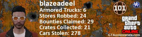 [URL=http://GTAonlinestats.com/showplayer/blazeadeel][IMG]http://GTAonlinestats.com/signature/blazeadeel/sig.png[/IMG][/URL]