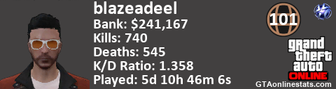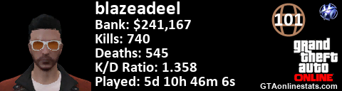 <a href="http://GTAonlinestats.com/showplayer/blazeadeel"><img src="http://GTAonlinestats.com/dmsignature/blazeadeel/sig.png" alt="blazeadeel" border="0" /></a>