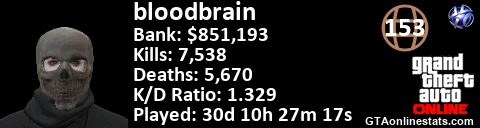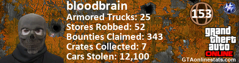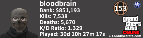 <a href="http://GTAonlinestats.com/showplayer/bloodbrain"><img src="http://GTAonlinestats.com/randomsignature/bloodbrain/sig.png" alt="Bloodbrain" border="0" /></a>