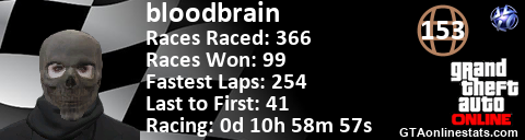 <a href="http://GTAonlinestats.com/showplayer/bloodbrain"><img src="http://GTAonlinestats.com/racesignature/bloodbrain/sig.png" alt="Bloodbrain" border="0" /></a>