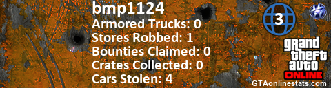 <a href="http://GTAonlinestats.com/showplayer/bmp1124/2"><img src="http://GTAonlinestats.com/crimesignature/bmp1124/2/sig.png" alt="bmp1124" border="0" /></a>