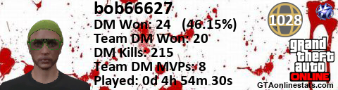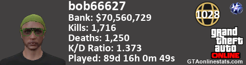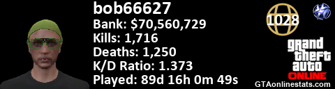 <a href="http://GTAonlinestats.com/showplayer/bob66627"><img src="http://GTAonlinestats.com/dmsignature/bob66627/sig.png" alt="bob66627" border="0" /></a>
