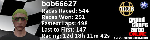 <a href="http://GTAonlinestats.com/showplayer/bob66627"><img src="http://GTAonlinestats.com/racesignature/bob66627/sig.png" alt="bob66627" border="0" /></a>