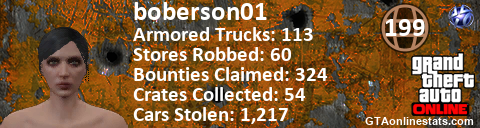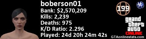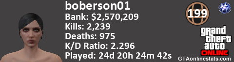 [URL=http://GTAonlinestats.com/showplayer/boberson01][IMG]http://GTAonlinestats.com/signature/boberson01/sig.png[/IMG][/URL]