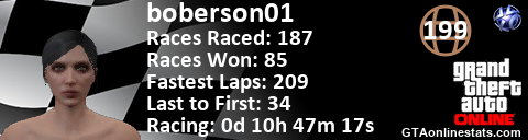 [URL=http://GTAonlinestats.com/showplayer/boberson01][IMG]http://GTAonlinestats.com/racesignature/boberson01/sig.png[/IMG][/URL]