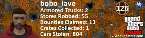 <a href="http://GTAonlinestats.com/showplayer/bobo_lave"><img src="http://GTAonlinestats.com/randomsignature/bobo_lave/sig.png" alt="bobo_lave" border="0" /></a>