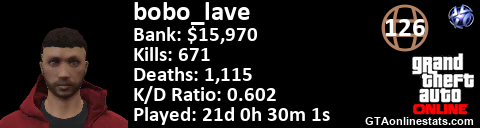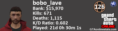 <a href="http://GTAonlinestats.com/showplayer/bobo_lave"><img src="http://GTAonlinestats.com/signature/bobo_lave/sig.png" alt="bobo_lave" border="0" /></a>
