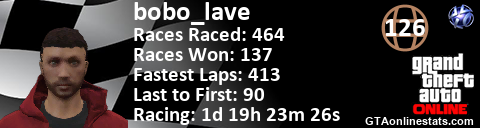 <a href="http://GTAonlinestats.com/showplayer/bobo_lave"><img src="http://GTAonlinestats.com/racesignature/bobo_lave/sig.png" alt="bobo_lave" border="0" /></a>
