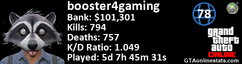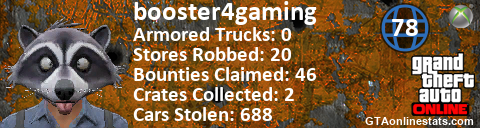 <a href="http://GTAonlinestats.com/showplayer/booster4gaming"><img src="http://GTAonlinestats.com/signature/booster4gaming/sig.png" alt="Booster4Gaming" border="0" /></a>