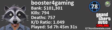 [URL=http://GTAonlinestats.com/showplayer/booster4gaming][IMG]http://GTAonlinestats.com/dmsignature/booster4gaming/sig.png[/IMG][/URL]