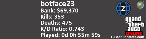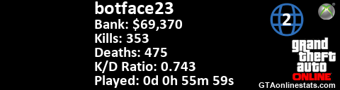 [URL=http://GTAonlinestats.com/showplayer/botface23/2][IMG]http://GTAonlinestats.com/signature/botface23/2/sig.png[/IMG][/URL]
